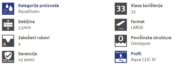 • Dvostruka zaštita od vlage koju pružaju nosiva ploča Aqua+ i vodonepropusni uklopni sustav Aqua CLIC it! ovom podu daje otpornost na vlagu tijekom 72 sata.